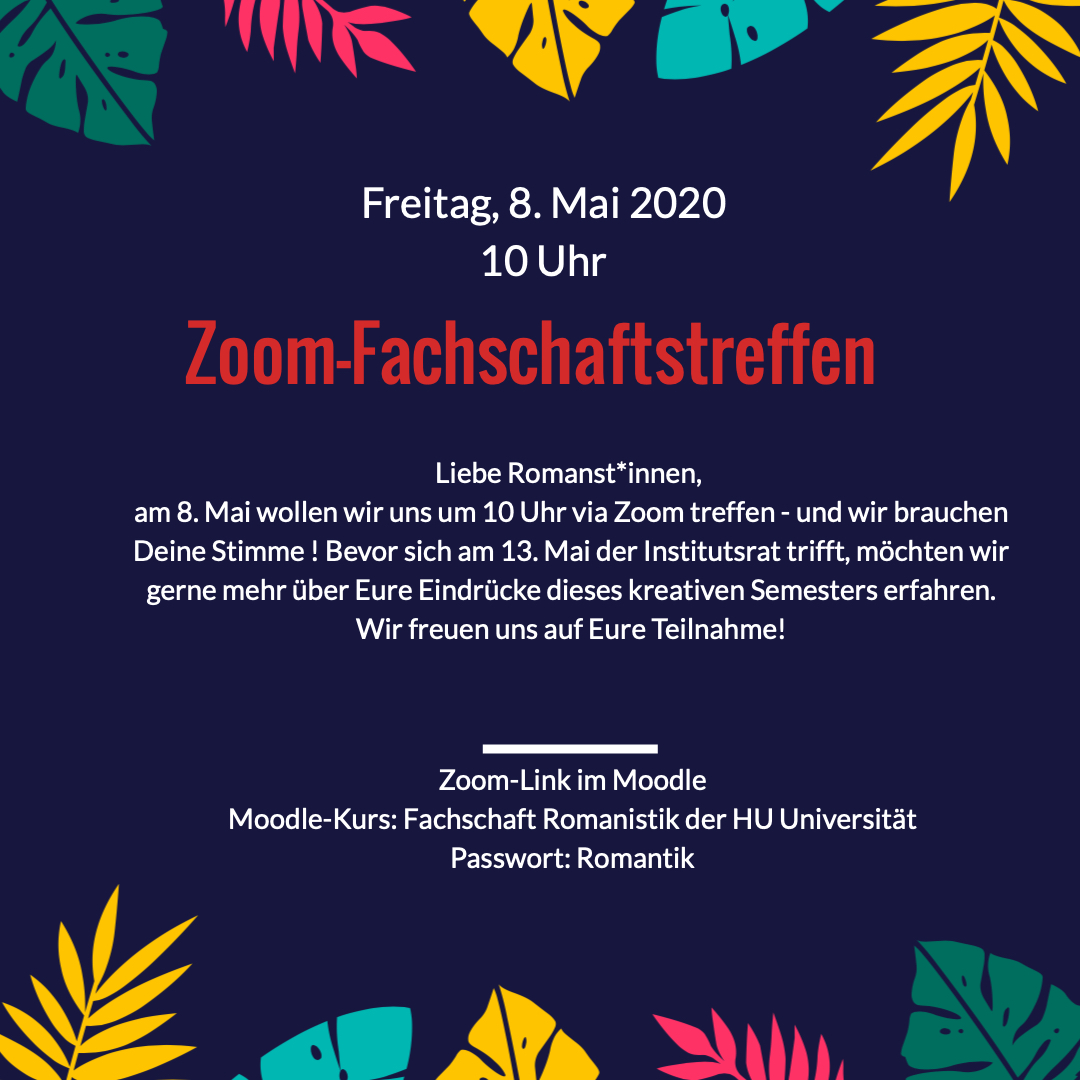 Humboldt-Universität zu Berlin | HU-Fachschaften | Fachschaft Romanistik | A k t u e l l e s | Fachschaftstreffen: Fr, 8.05.2020, 10 Uhr Fachschaftstreffen: Fr, 8.05.2020, 10 Uhr Foto: FSI-Romanistik Einladung zum Fachschaftstreffen.jpg image/jpeg Typ image/jpeg Dimension Abmessungen 1080x1080 Size Dateigröße 535.4 KB Herunterladen Bild in voller Größe anzeigen…